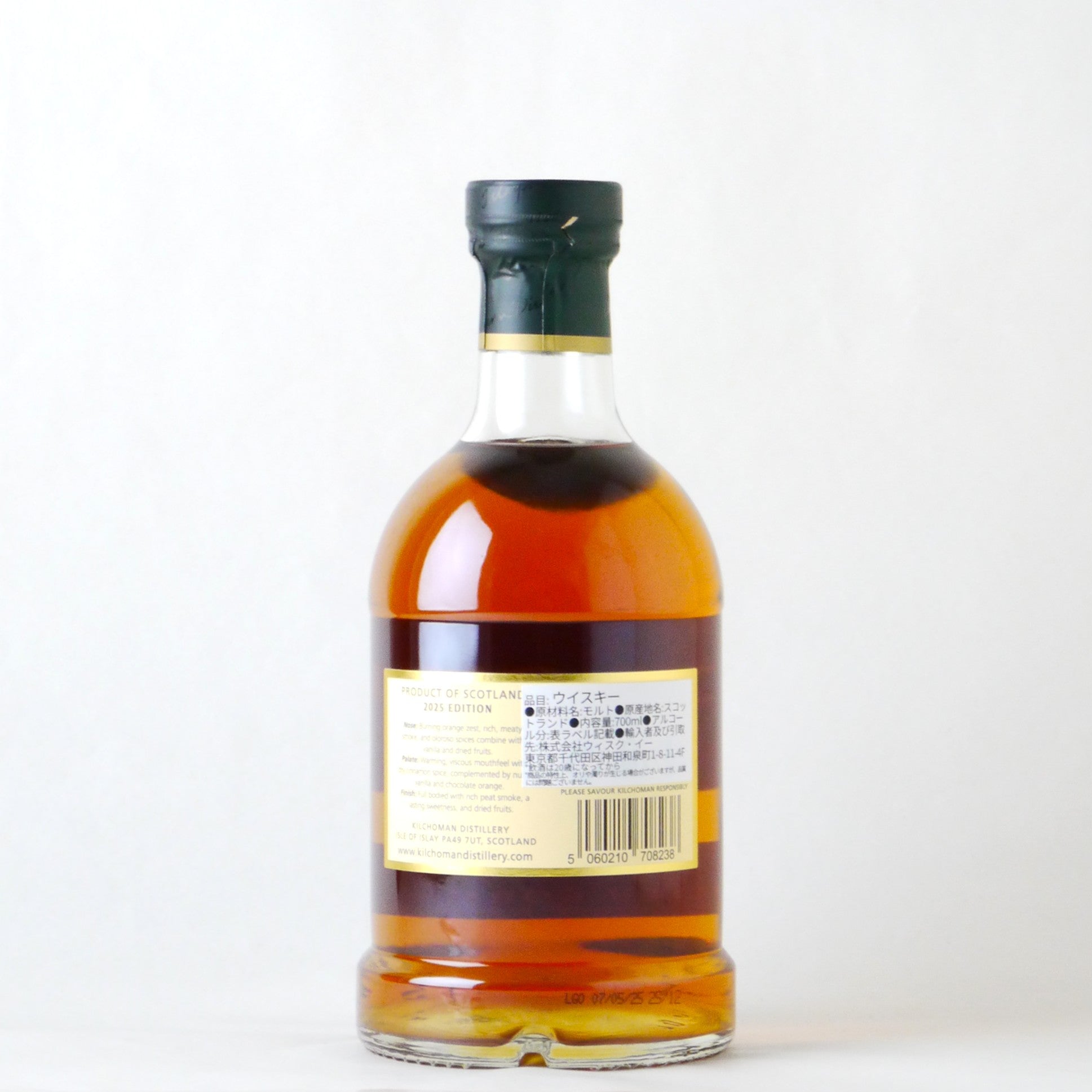 2025年リリースは、ロッホゴルムの初となる10年熟成で、オロロソシェリーバット原酒23樽を使用しています。キルホーマンらしいシトラスがほんのり効いたスモーキーな味わいに、熟成由来の、豊かなスパイスやダークフルーツを感じる甘みがしっかりと加わりました。ピートとオロロソシェリー樽の特徴が見事に融合した、年に一度の上質な味わいをお楽しみください。